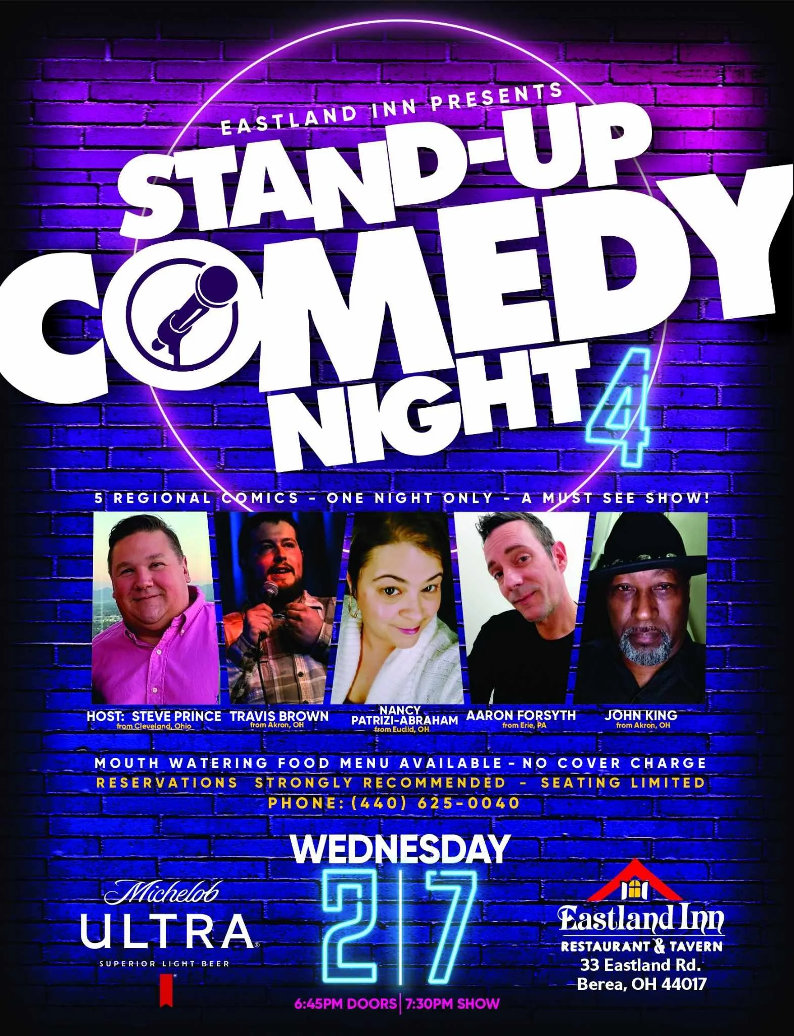 Back to All Events Comedy Night at the Inn Wednesday, February 7, 2024 7:30 PM 10:00 PM Eastland Inn 33 Eastland Road Berea, OH, 44017 United States (map) Google Calendar ICS